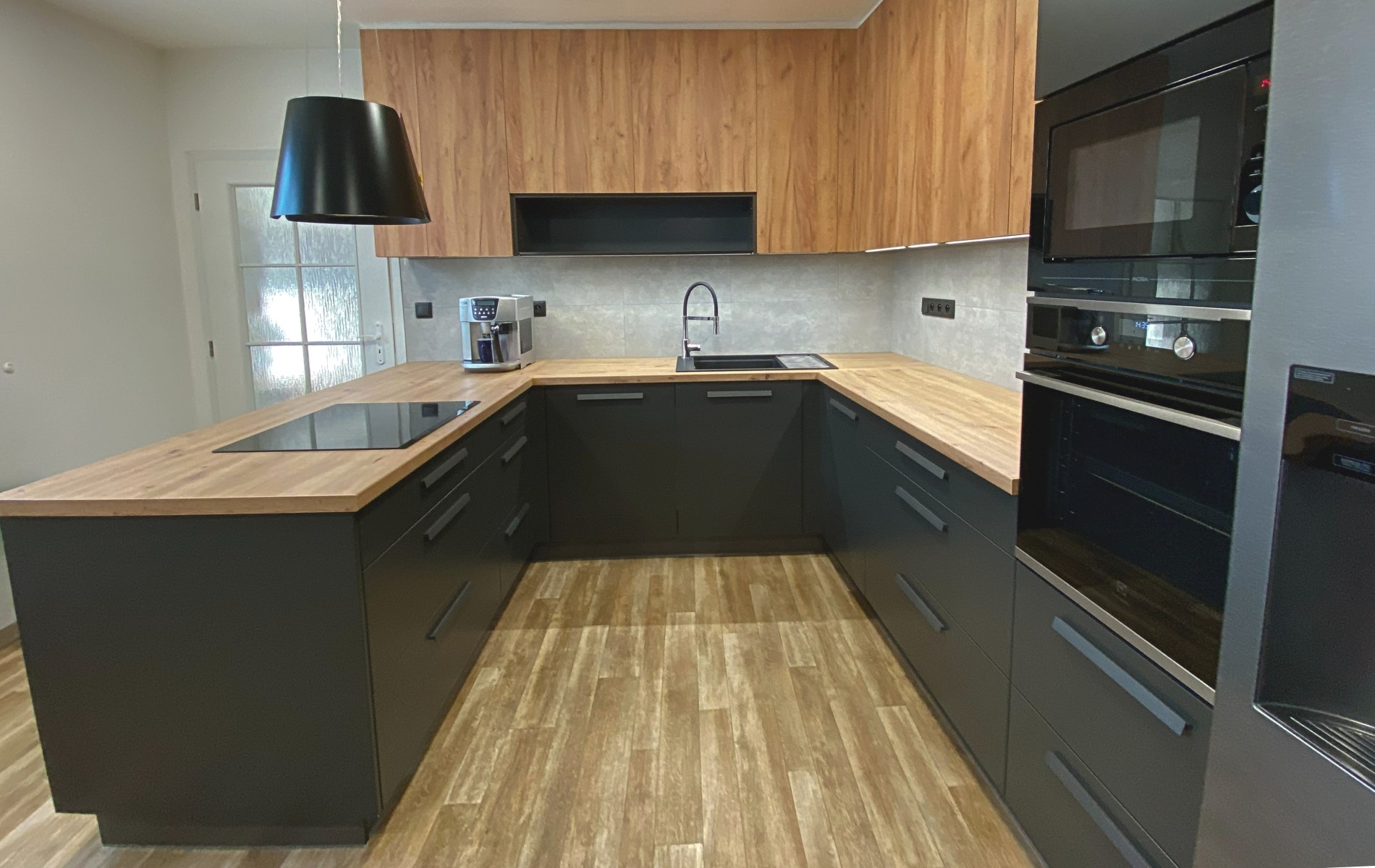Kuchyně do U v kombinaci laku titan mat a lamina dub zlatý