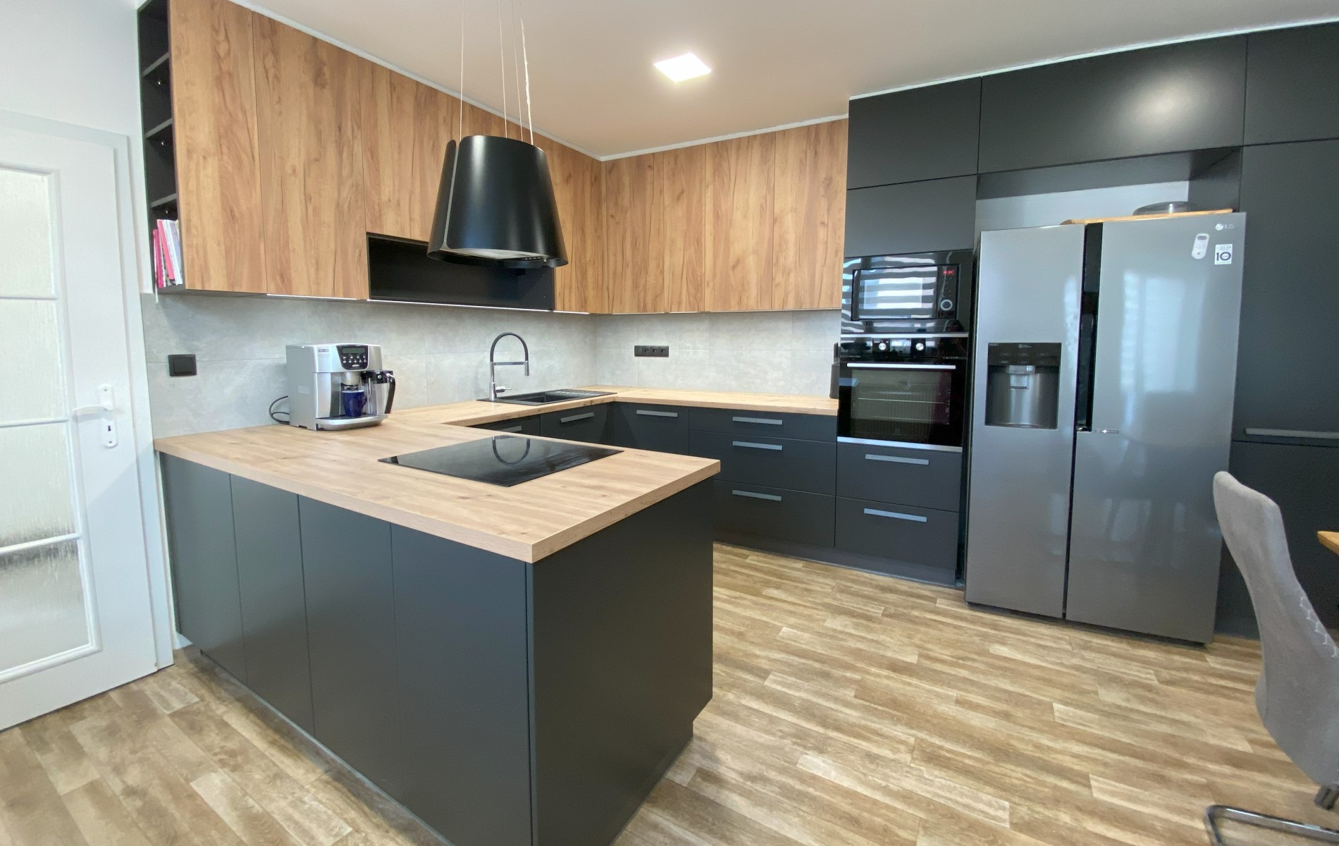 Realizace kuchyňské linky do tvaru písmene U HANÁK Line / Optima. Celkovému modernímu vzhledu kuchyně dominují lakované povrchy v odstínu titan star mat, které krásně kontrastují s dřevodekorem dub zlatý. Vše doplňuje pracovní deska v dekoru dřevo královské a kuchyňský velkoformátový obklad v imitaci šedého kamene.