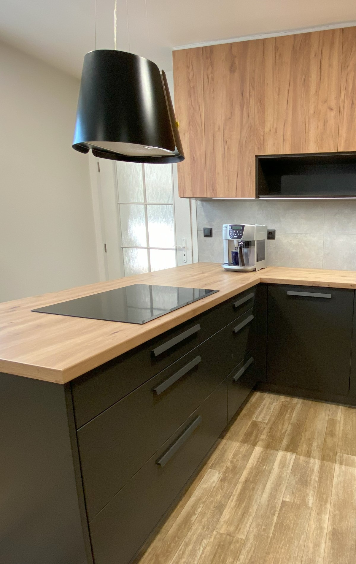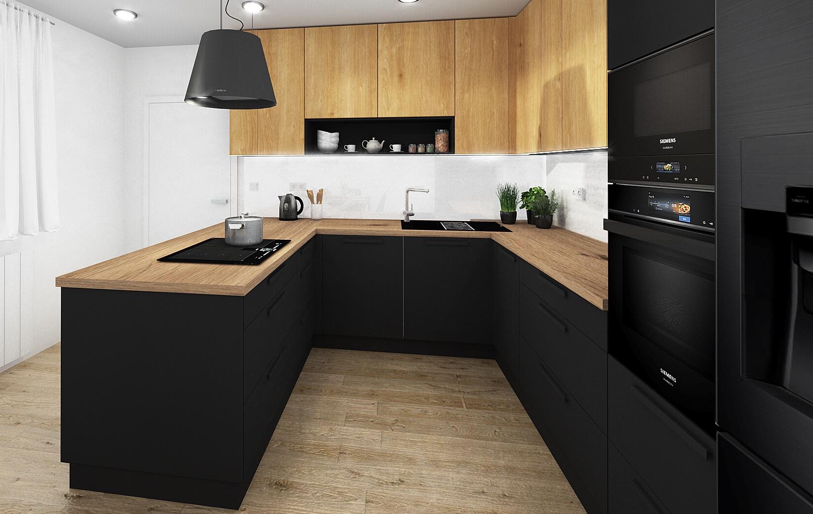 Lakovaná dvířka jsou doplněna nenápadnou lakovanou úchytkou. Horní skříňky v dřevodekoru se otevírají pomocí zapuštěné úchytkové lišty s LED osvětlením.