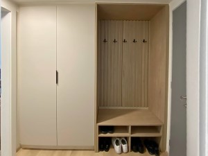 Předsíň v kombinaci lamino bílá a dub nagano Předsíňová sestava se zrcadlem v laminu javor medový Předsíňová stěna v bílém laminu Předsíň s bukovými profilovanými dvířkami