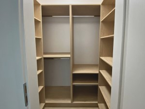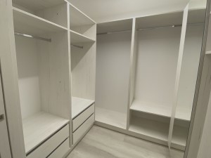 Prostorná šatna v laminu akát Šatna v laminu bříza Šatna v bílém laminu Pokoj pro dospívajícího chlapce se šatnou