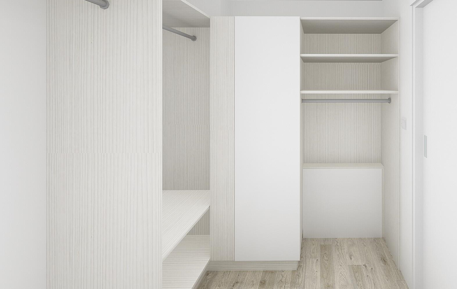 Modul napravo byl navržen na míru tak, aby prostor pro ukládání zůstal plně využitý a rozvaděče zůstaly snadno přístupné – stačí odsunout zavěšené oděvy na šatní tyči.