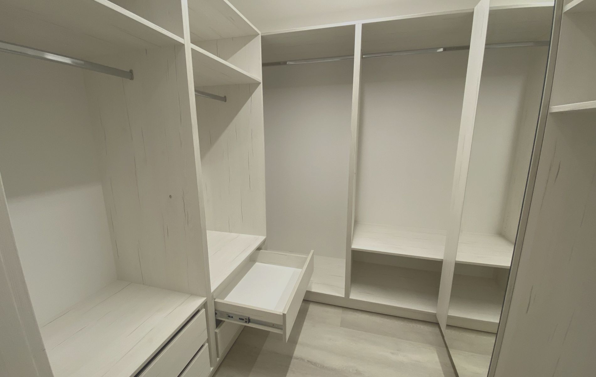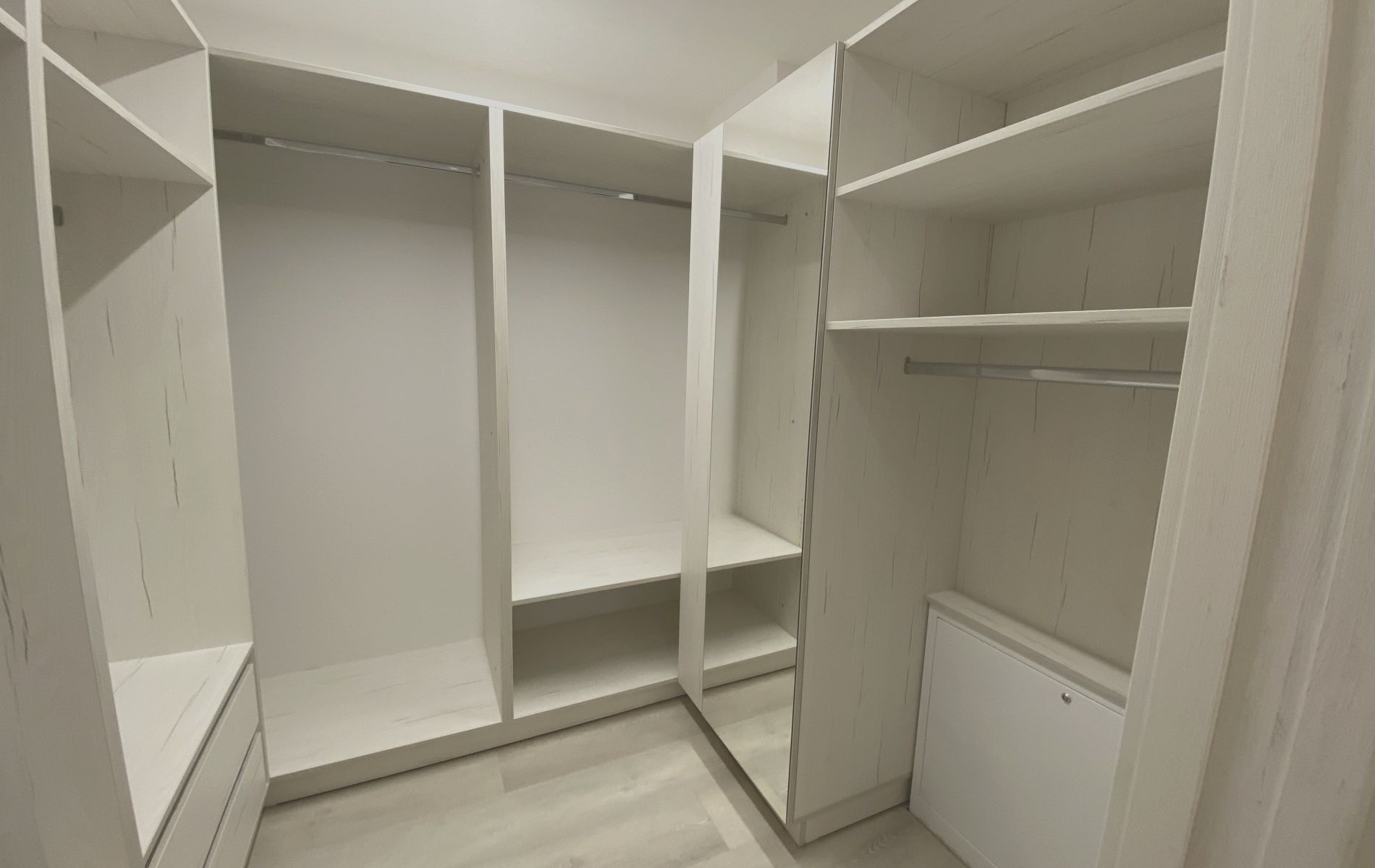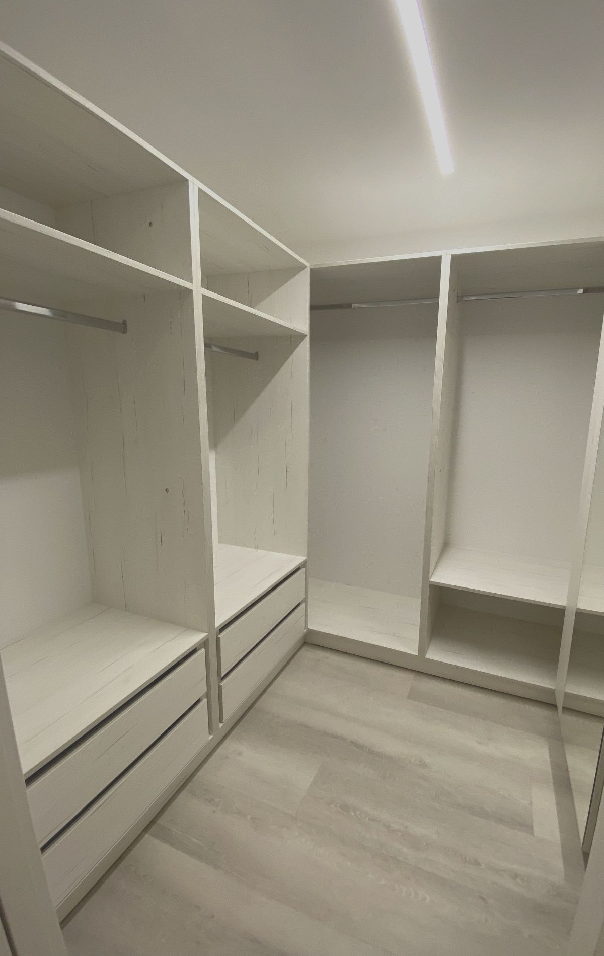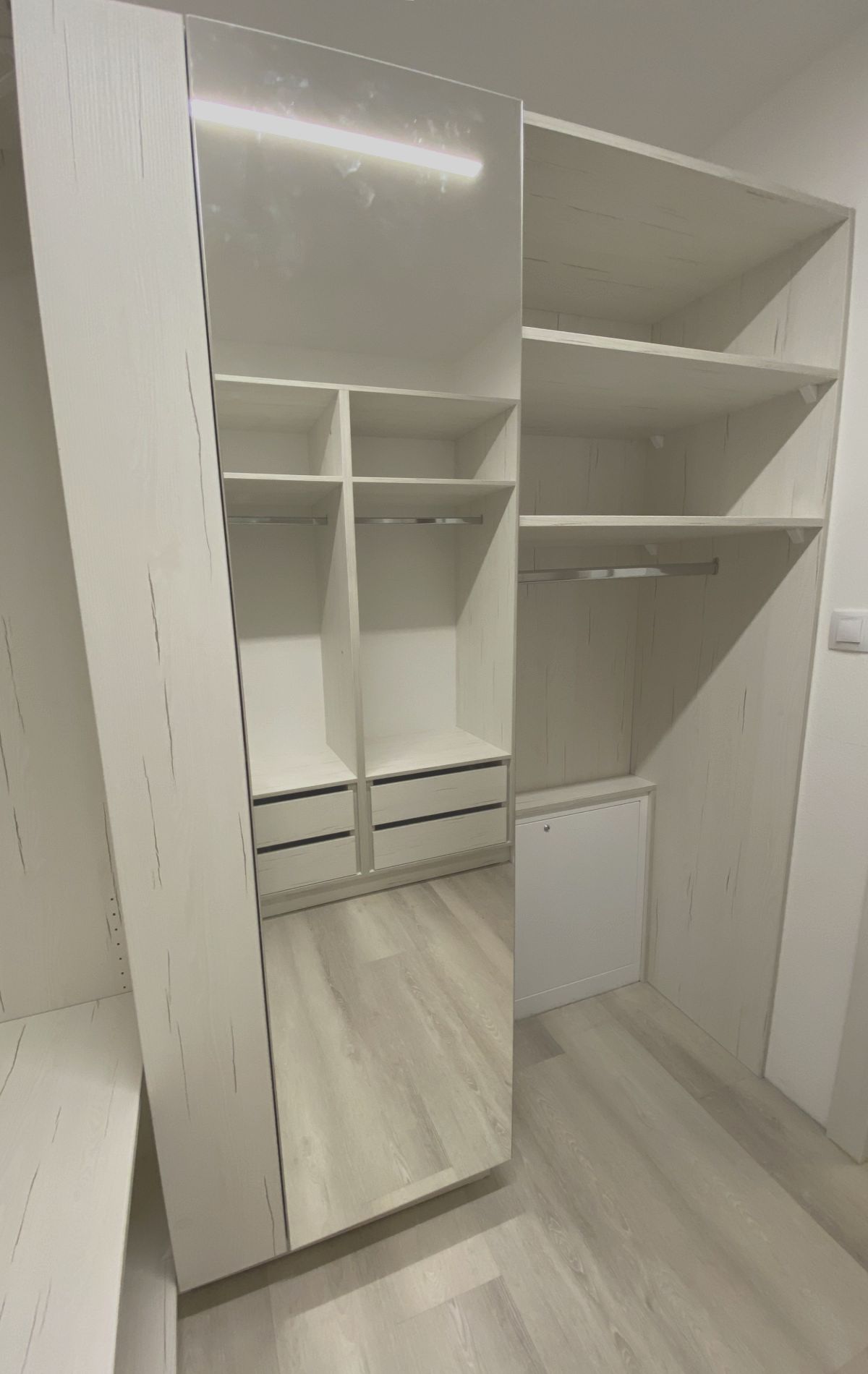 Nejoblíbenější kombinace šatních tyčí, polic a zásuvek byla zvolena i do této šatny. Pro ještě větší pohodlí je šatna doplněna o skříň s dvířky, na které je nalepeno zrcadlo – ideální pro rychlou kontrolu outfitu a optické zvětšení prostoru.