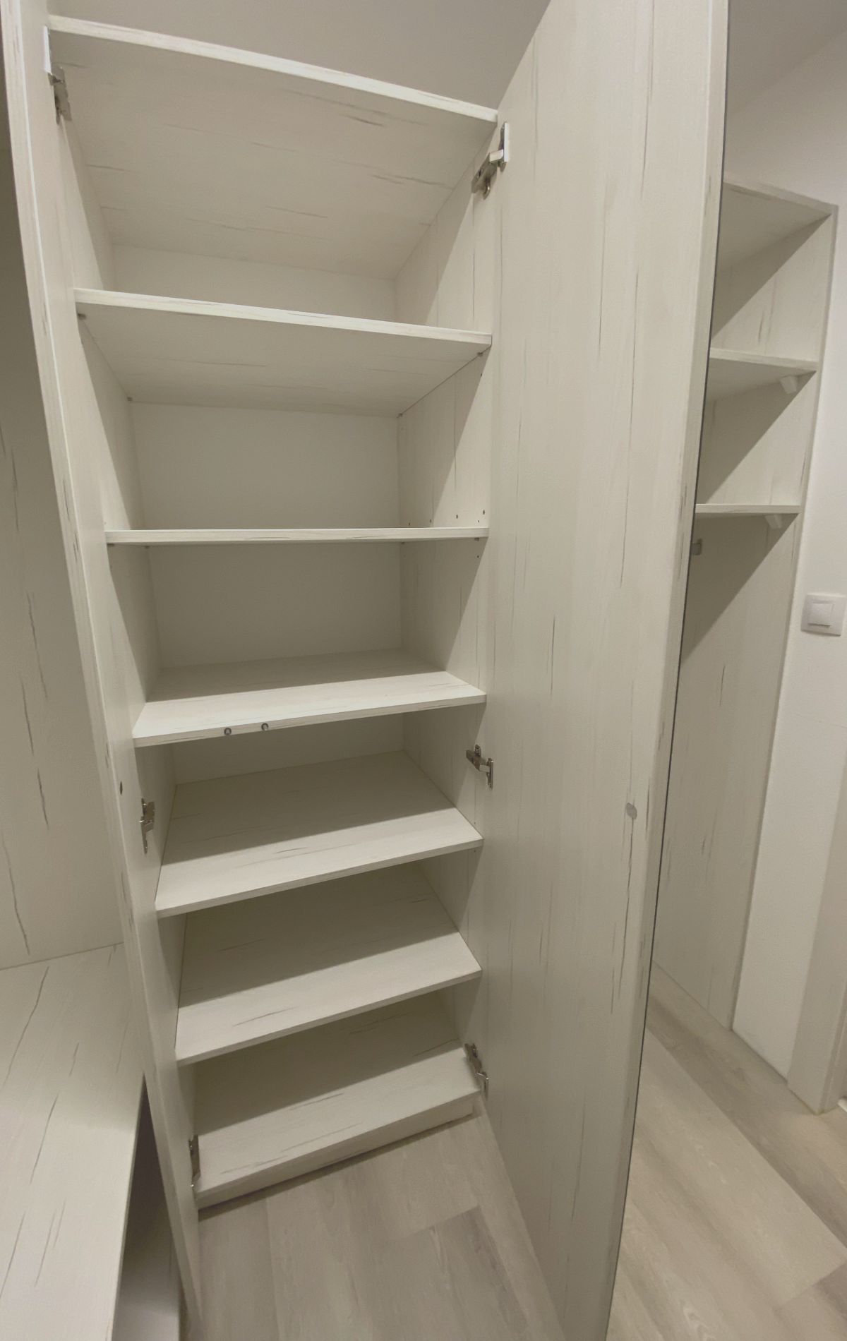 Jako vnitřní vybavení skříně, otevírané bezúchytkovým mechanismem tip-on, byly zvoleny volné police, které je možné podle potřeby přemisťovat.