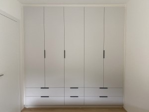 Vestavné skříně se středovou policovou částí graphite grey / dub sodoma Vestavné skříně s klasickými otevíravými dveřmi v zeleném laminu Pracovna s vestavěnými skříněmi dub karamel / latte Bílá vestavná skříň s vnitřním osvětlením