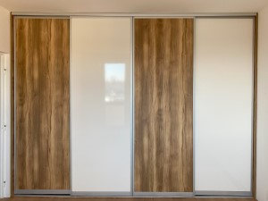 Vestavné skříně s pantovými dveřmi v provedení akryl kašmír Vestavné skříně dub baroko zlatý / Mirror Gloss bílý lesk Vestavná skříň do pokoje v provedení champagne Vestavná skříň s posuvnými dveřmi v dřevodekoru akát