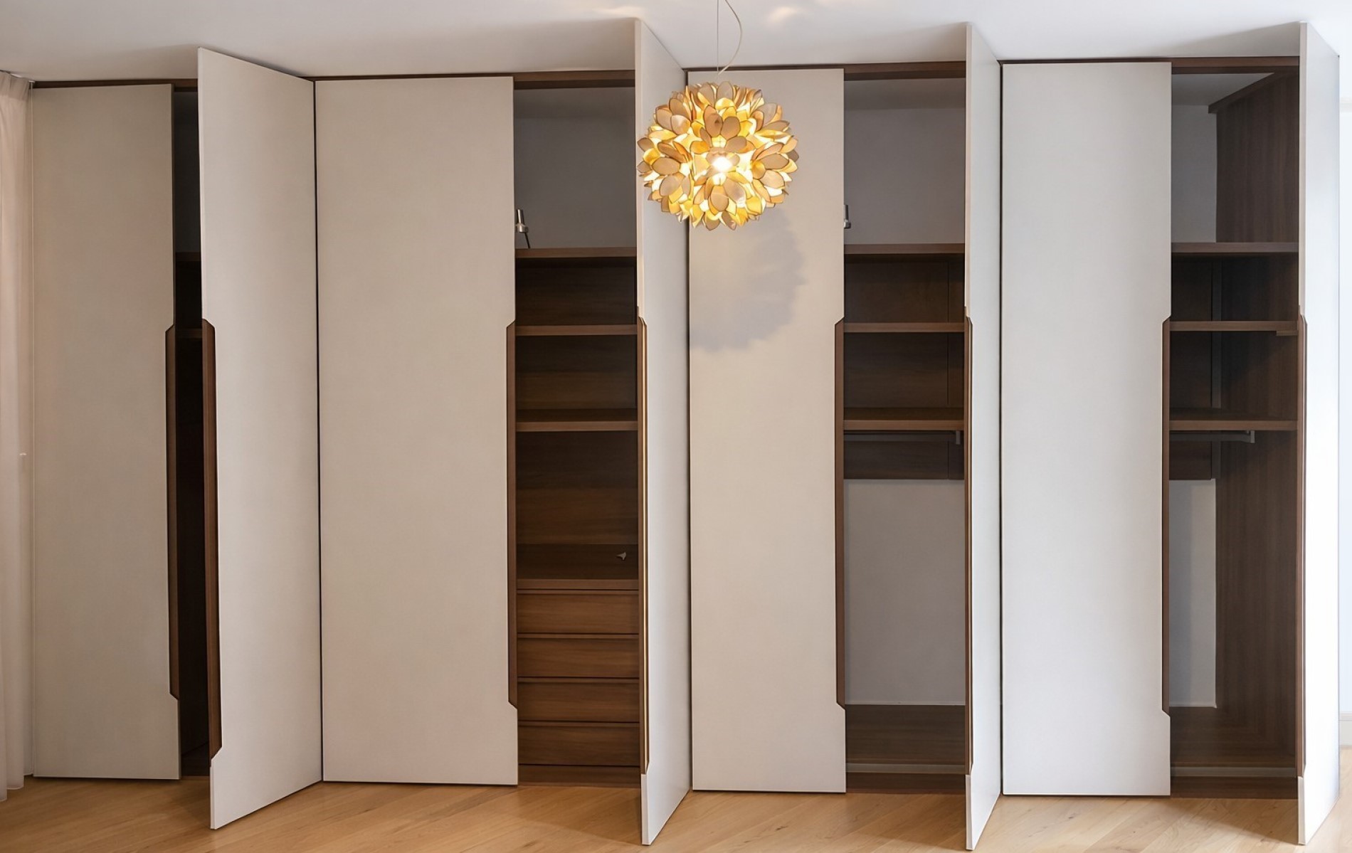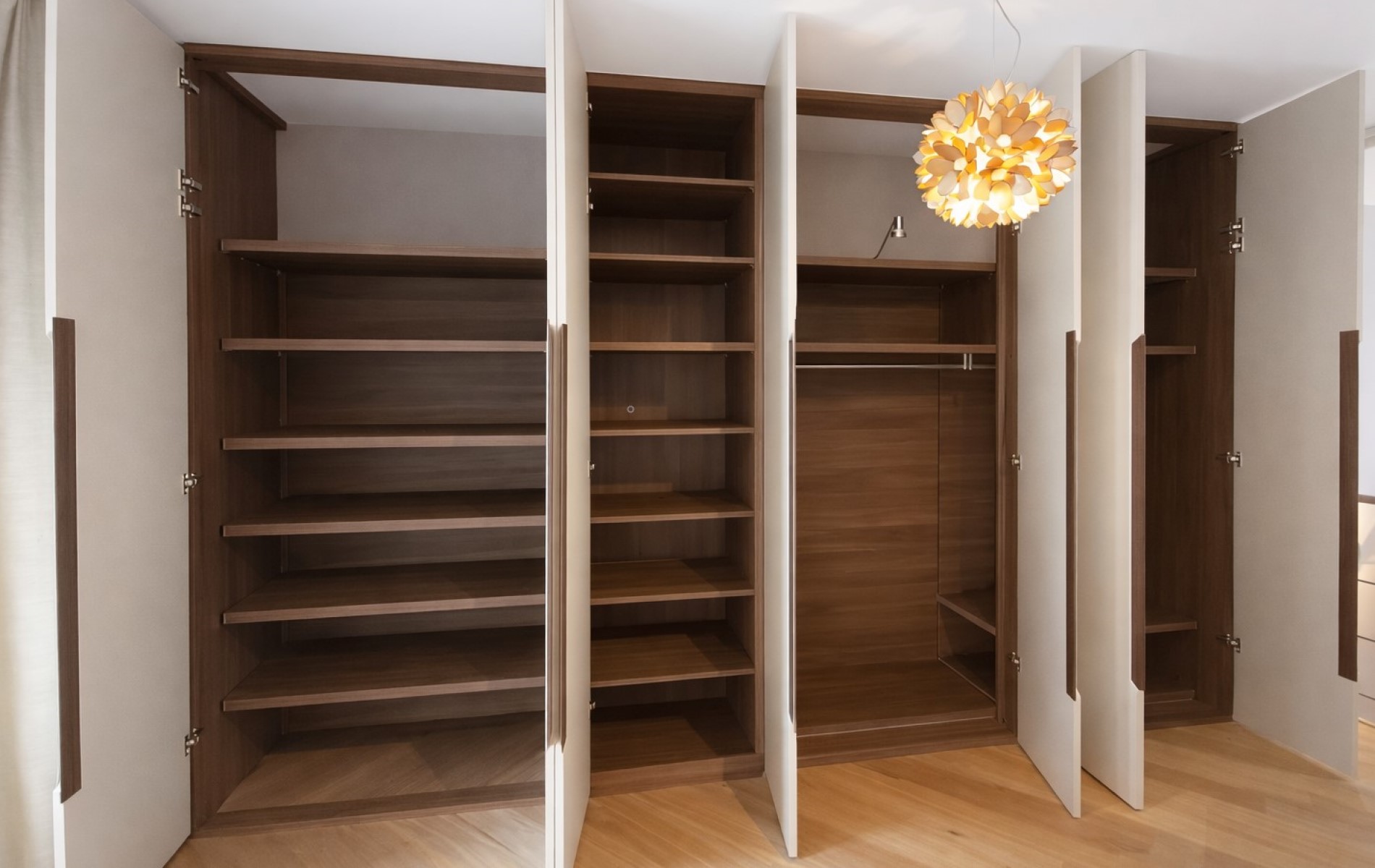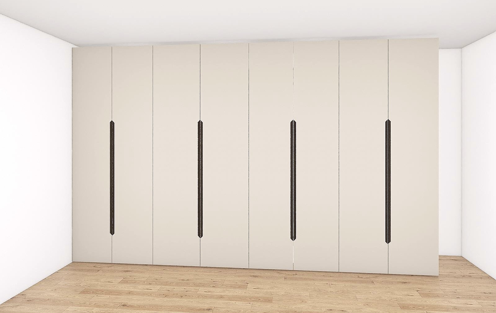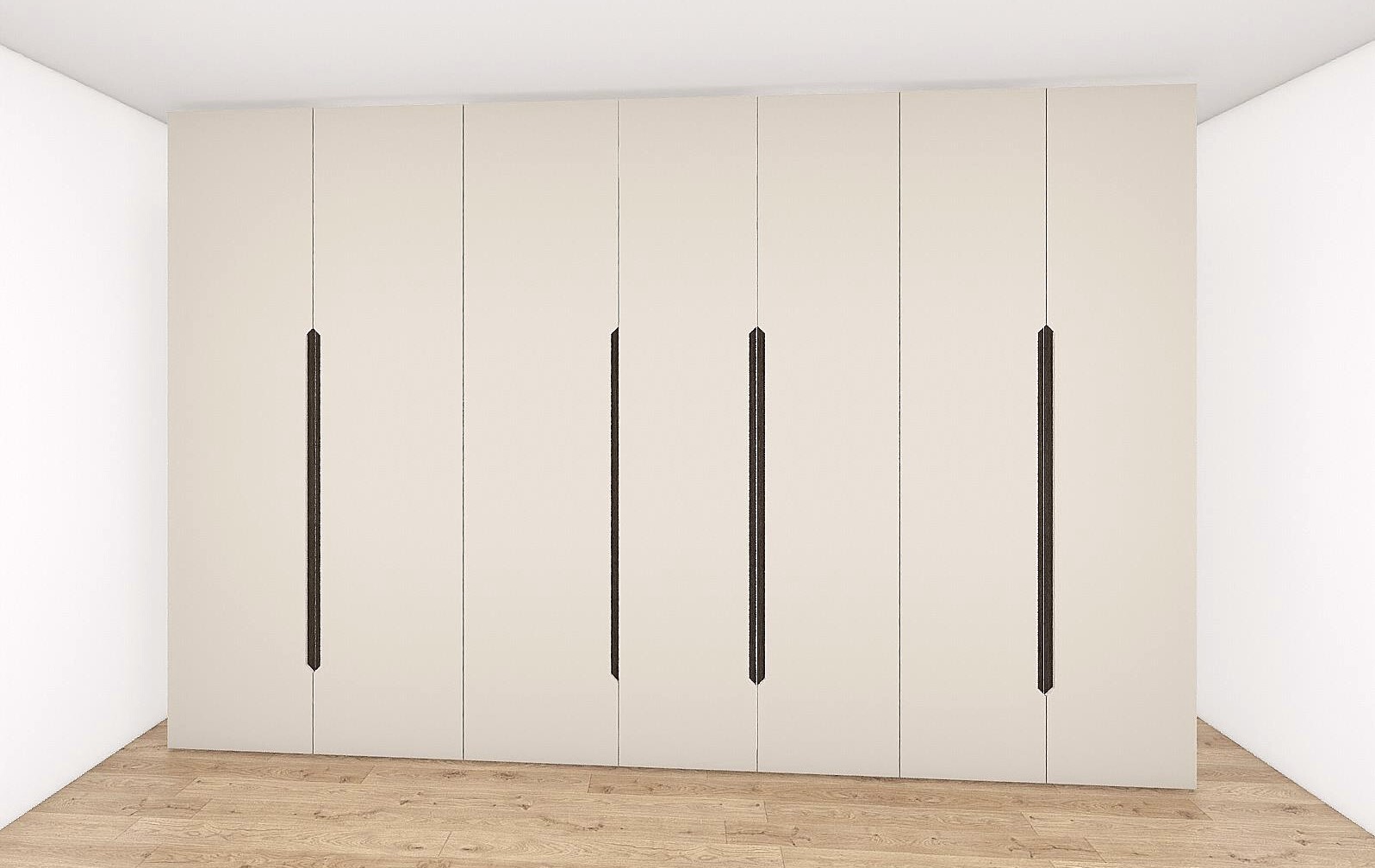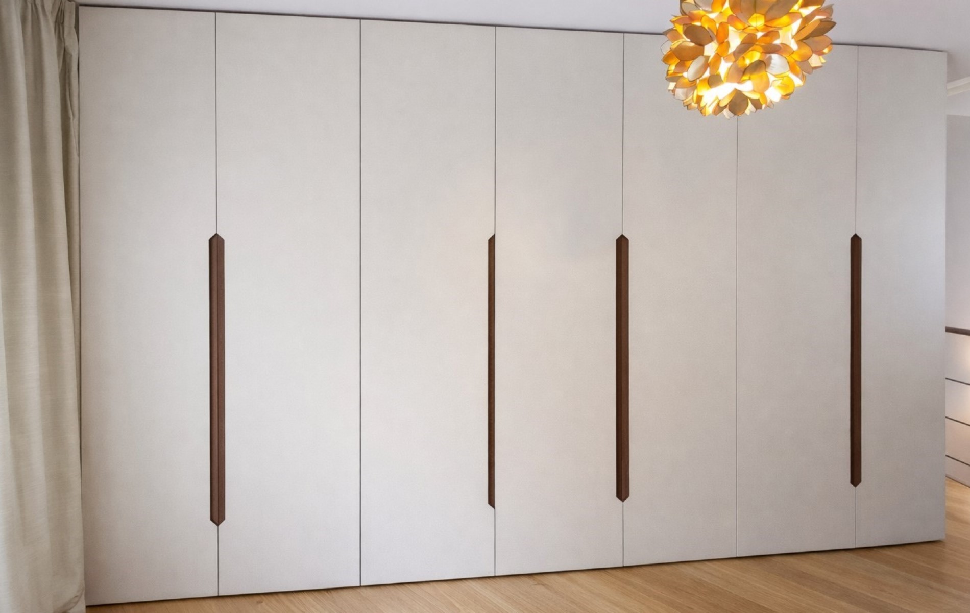 Realizace dvou vestavných skříní HANÁK Solid v kombinaci matného laku champagne a dýhy ořech americký.