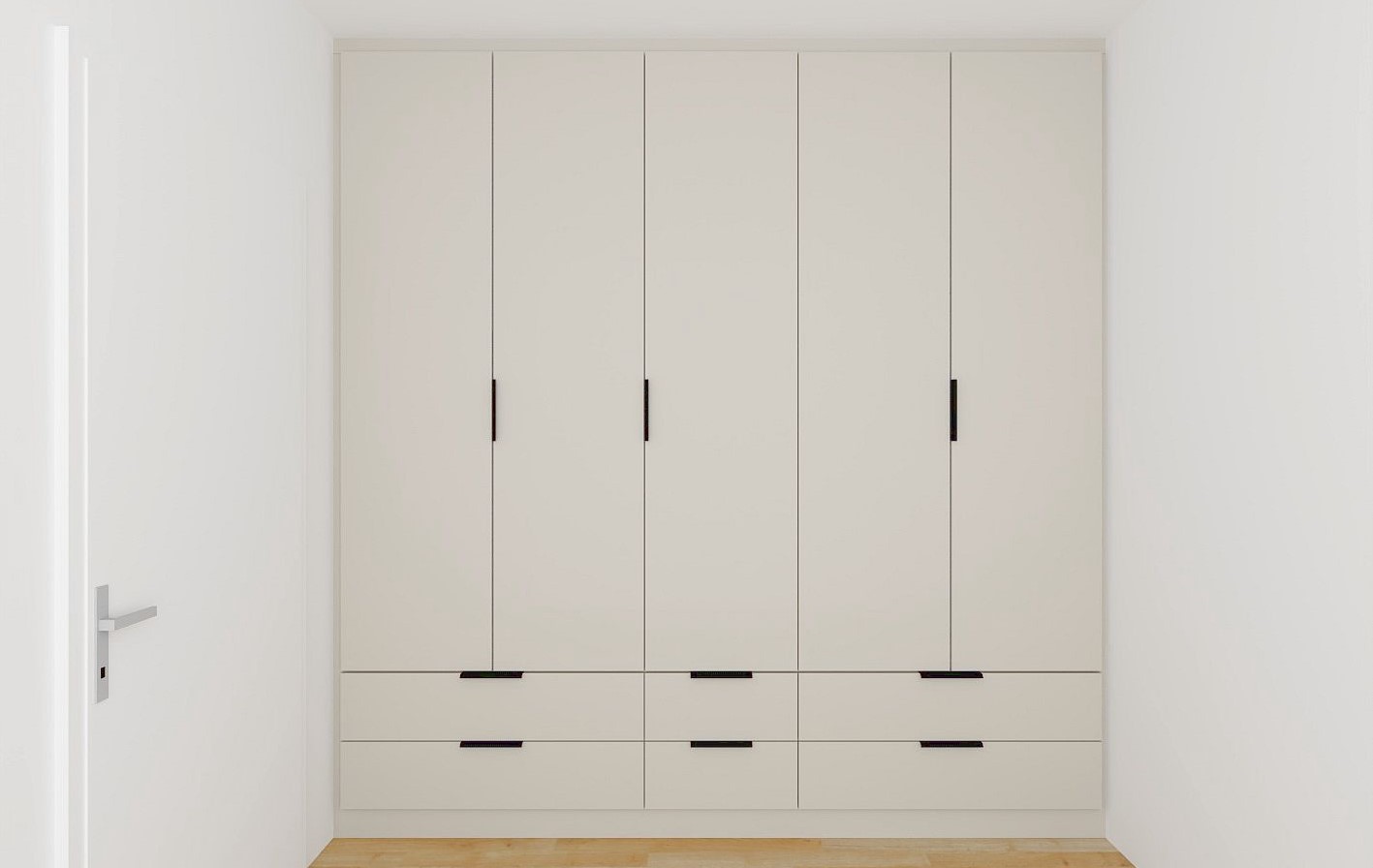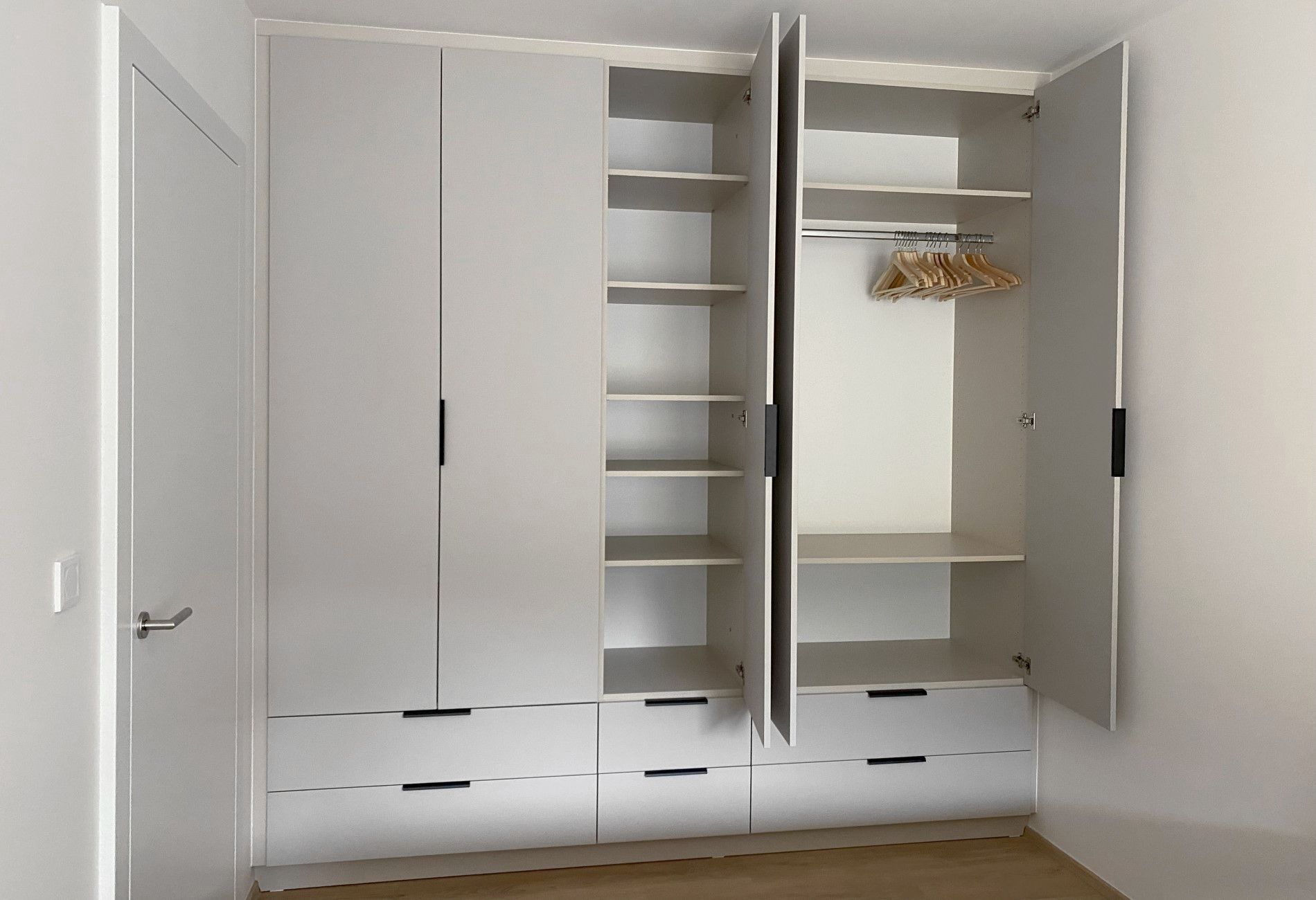 Realizace vestavné skříně s klasickými pantovými dveřmi v provedení akryl kašmír mat. Korpus nábytku je v laminu champagne.